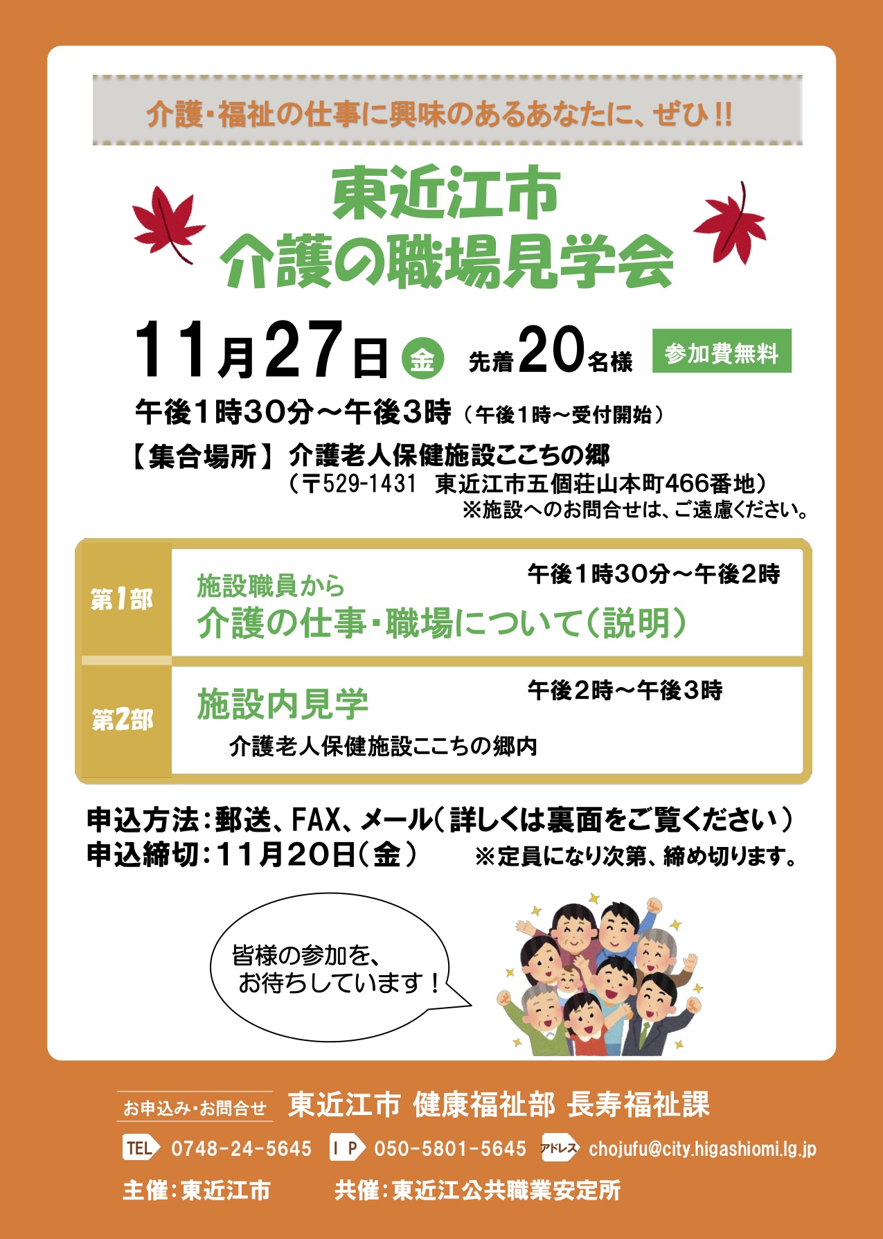 介護老人保健施設ここちの郷にて、東近江市主催の「東近江市介護の職場見学会」が開催されます。(申し込み先は東近江市健康福祉部 長寿福祉課になります) 日時: 令和2年11月27日(金)13時30分から15時まで 場所: 介[...]
