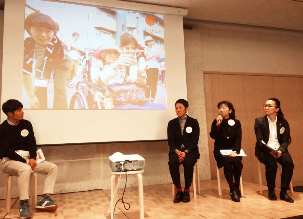 まずはオープニングトーク「福祉最前線!」。各法人から「これ!」という取組みのリレープレゼン&トークショーで、各法人の次世代リーダーがステージへ上がった。リガーレからは、きたおおじ施設長杉原氏が「超える」というキーワードでリガーレを説明、法人の枠を超えるリガーレの取組みと施設を超えて地域に飛び出していくきたおおじの取組みを紹介、興味を持った学生もあり、フリータイムに杉原さんを呼び止め話している姿を目にした。